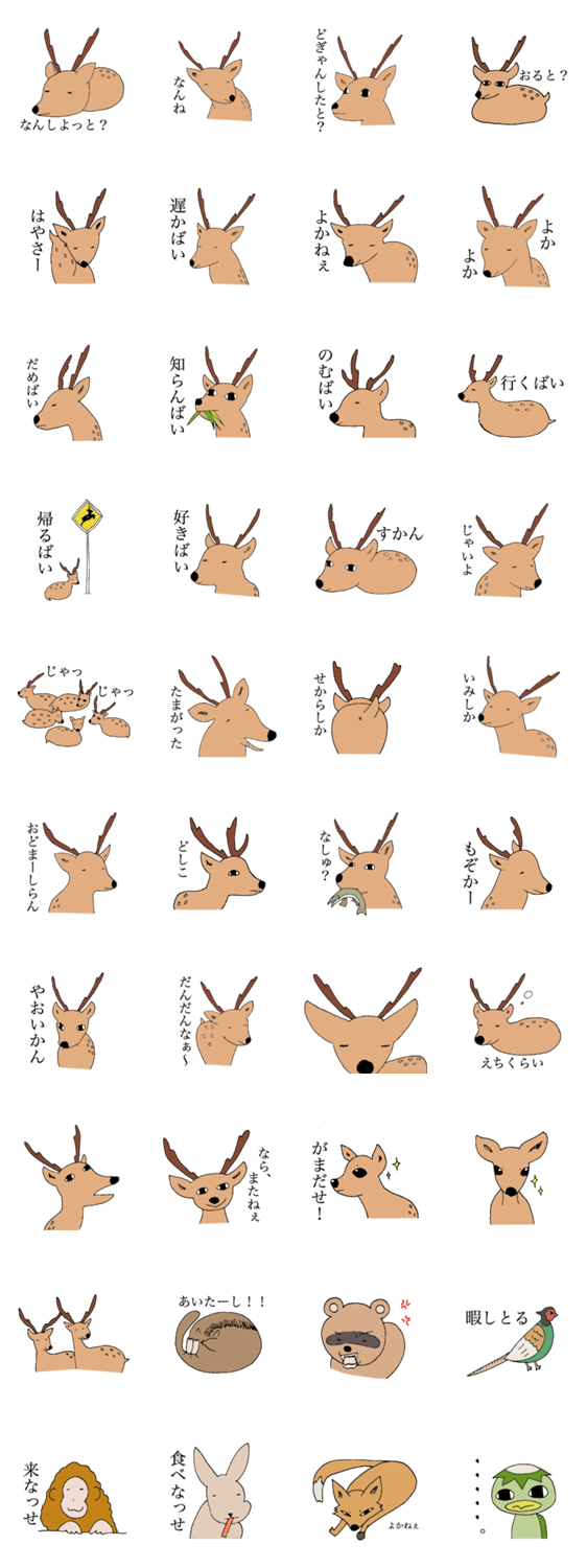 | スタンプ説明 | 人吉球磨地方の方言を話す鹿とその仲間たち。わかならい人たちは勘で使ってください。 |