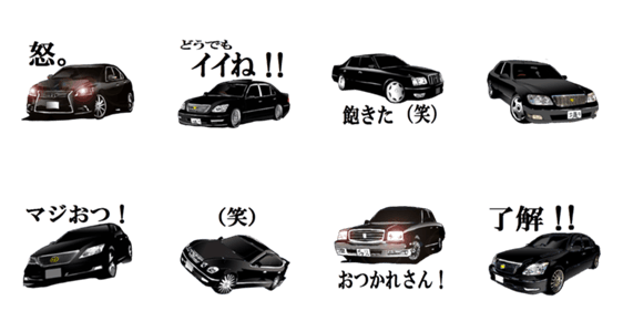 | スタンプ説明 | 黒塗り高級車スタンプの老舗、全日本高級漆黒車会の総本部より愛をこめて第二弾、(挑・ちょう)の登場です!威圧感たっぷりのスタンプでアイツをあっと驚かせよう!! |
