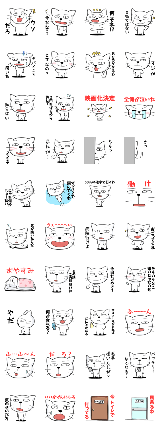 なんとなく憎たらしい顔のネコが、いろんなリアクションをします!セリフ付きなので文字を打つ作業が省ける!(かもしれない)