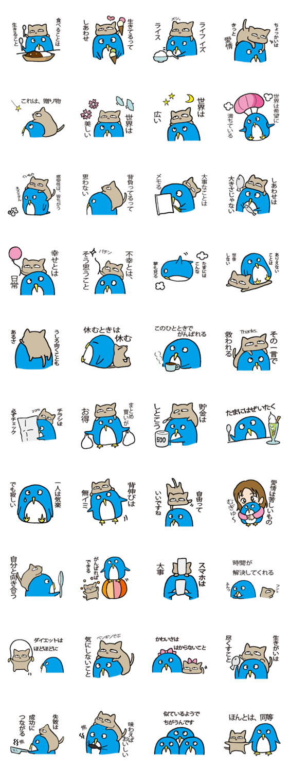 | スタンプ説明 | ネコさんに依存されつつもがんばるペンギンさん流の哲学。 生きていくためのヒントがあるかも?! |