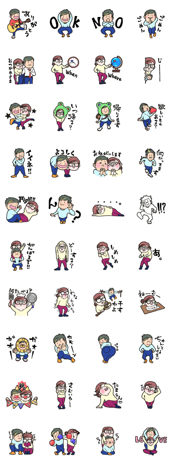 ゆる〜い夫婦のスタンプです。夫婦やカップルが日常で使える言葉や、クスッと笑える2人の行動を盛り込みました。