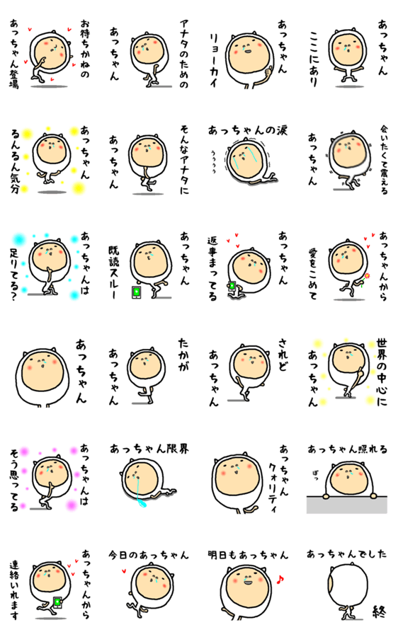 あっちゃんが使える脱力系のゆるゆるなスタンプ。あき/あきこ/あつひこ/あつお/あきな/あきえ/あつこ/あつろうさんにおすすめ