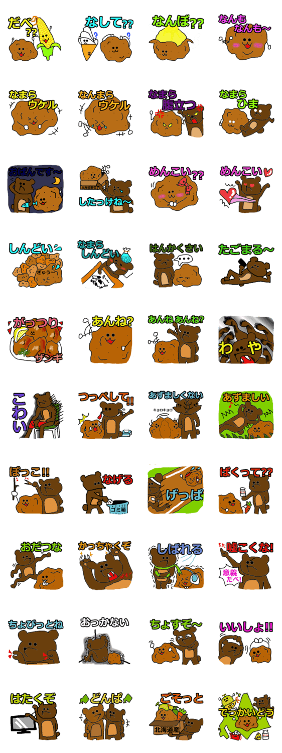 どさんこのじゃがいもとクマが北海道の方言でスタンプになりました!ご当地スタンプ北海道弁、とうもろこし、メロンがいます。文字入りです!作者道民!よろろー!