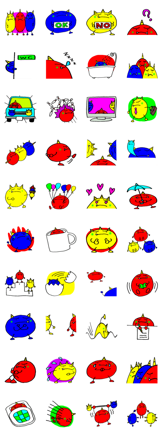 鬼の仲良し三人組「オニンズ」。赤、青、黄ですが、信号機ではありませんよ。鬼だけど、まるくてかわいい鬼たちだよ。