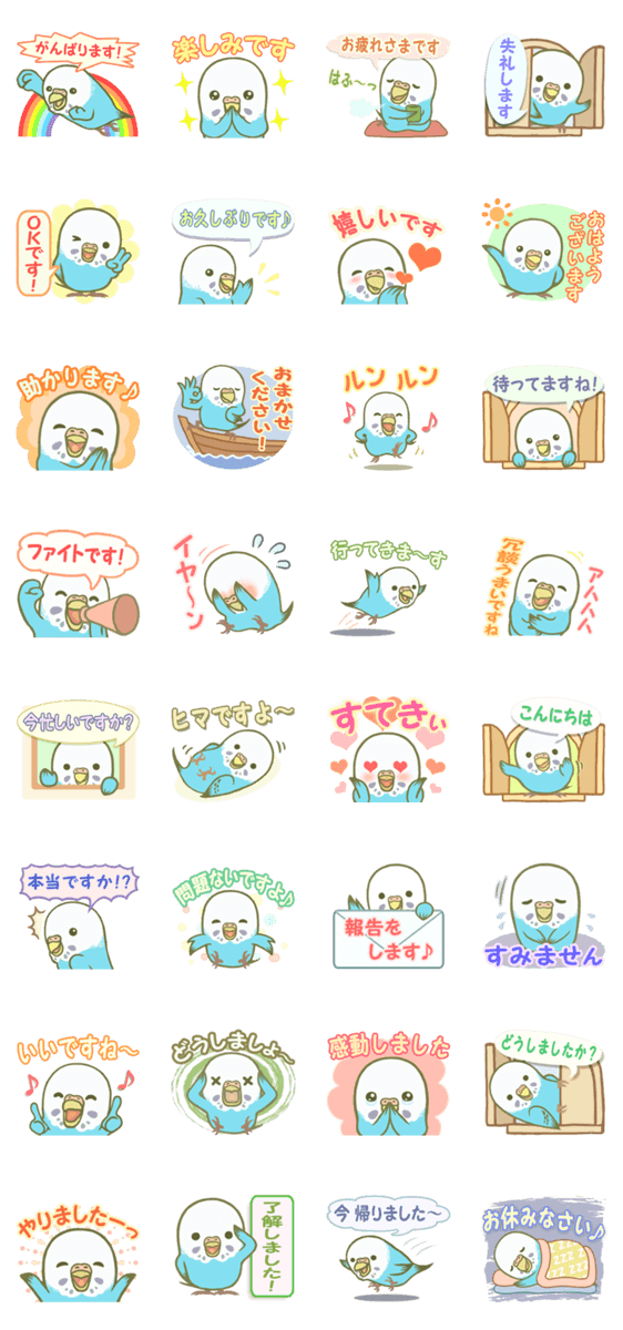 背黄青鸚哥の女の子「セイコさん」の敬語を使った可愛いスタンプだよ。 がんばります、楽しみです、お休みなさい、お疲れ様です等いろんなセリフのスタンプがあるよ。