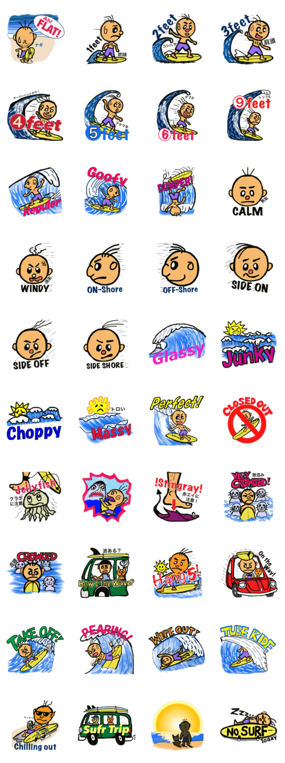 | スタンプ説明 | 丘ではクールにしているけど、いざ海の中ではズッコケサーファーのJohがサーフポイントのコンディションを楽しく伝えちゃいます! |