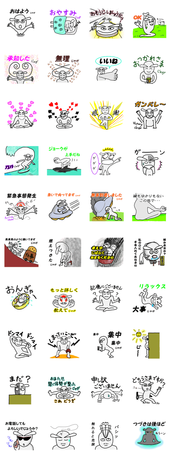 惑星ジャガからやって来た宇宙人サンちゃんのスタンプです。既に日本語をマスターしてますが、ジャガ星の方言が出ることあります。趣味はヨガ、付け髭収集、波乗りなど。