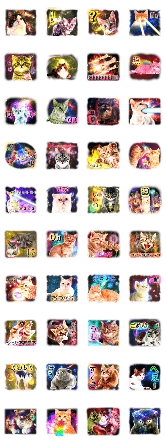 | スタンプ説明 | 実写ニャンコ達が登場!ねこ写真スタンプ第8弾!かわいいネコ写真による面白スタンプで、SFな宇宙猫が登場。スぺ―シーでレトロでファンタジーなスペースにゃんこ達。 |