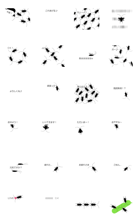 カサカサ動くゴキブリ達の第5弾は吹き出しスタンプです。吹き出しに群がるゴキブリで友達や恋人の反応を楽しんでください♪ゴキブリの顔文字もあります★(((((((((ー| )<