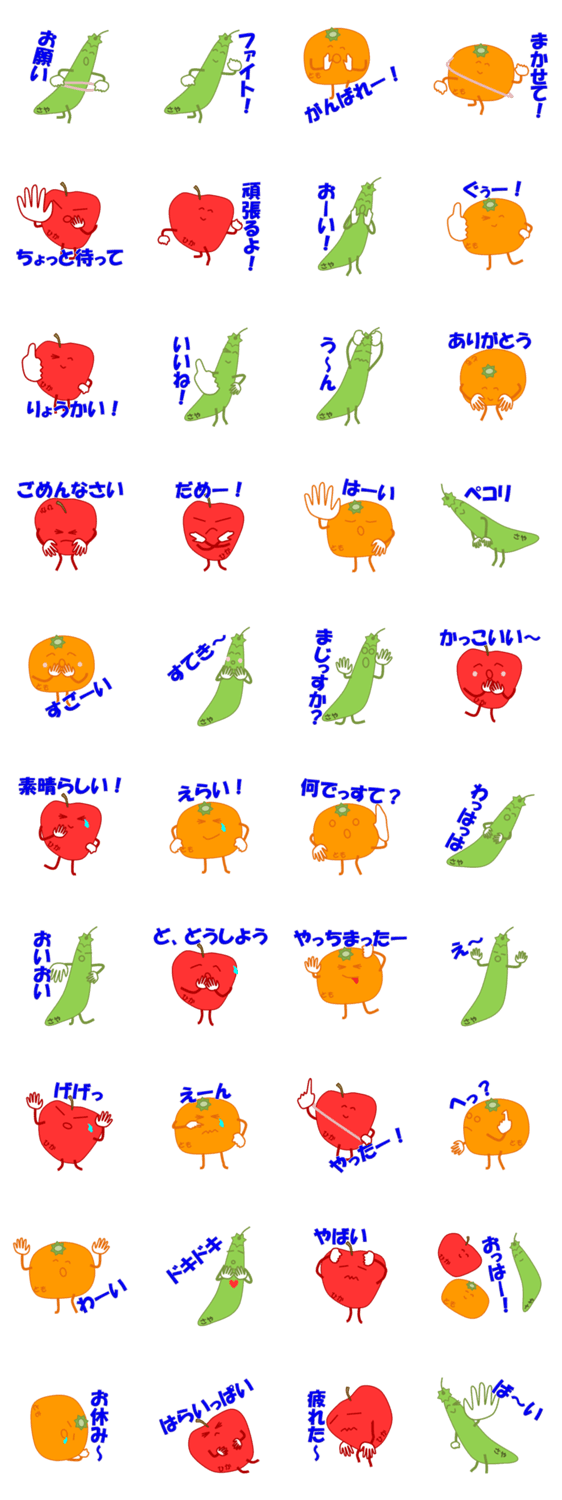 ひかリンゴ・ともミカン・さやエンドウの3人娘のかわいいスタンプです。