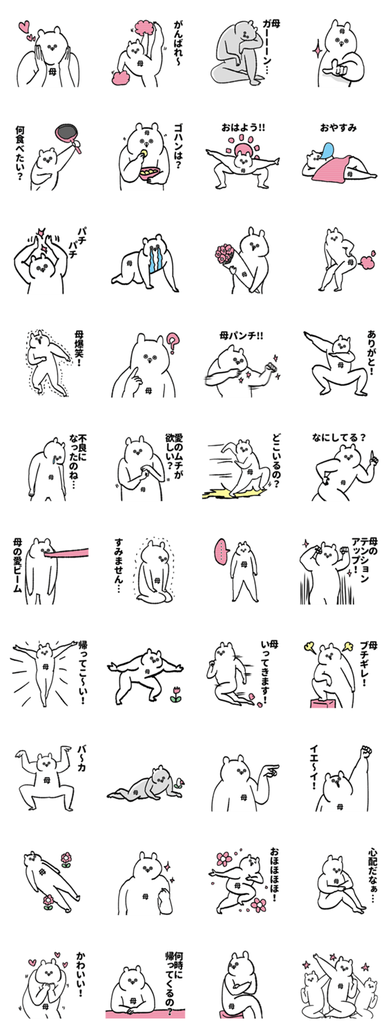 母,ママ,お母さん,が使えるスタンプです。子供,父,パパ,に仕えて便利です。家族とのメッセージが盛り上がります。変なキャラなので笑いがうまれます!家族に光と笑顔を!!