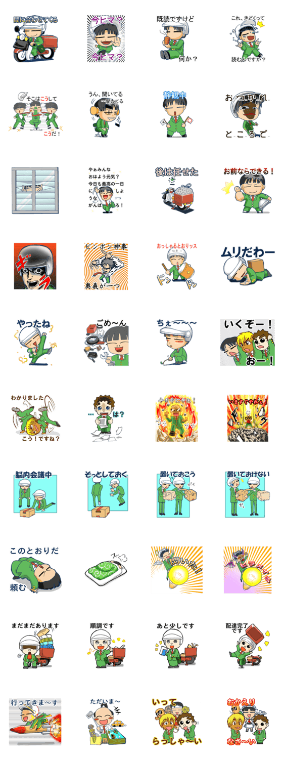 | スタンプ説明 | 先の配達員の他に、自分勝手な配達員を追加しました。仕事や会話でのやりとりにいかがですか? |