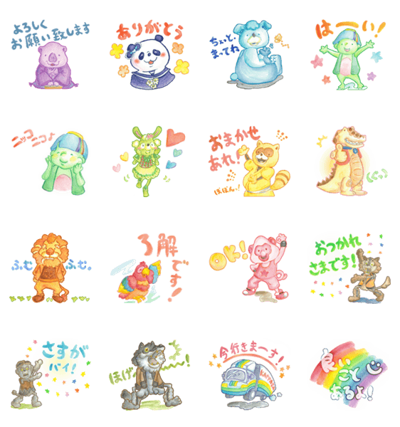 劇団カッパ座のオリジナル作品、『なないろのにじ』からいずみの森のなかまたちがスタンプになりました! Illustration by Tonae Mitsuhashi.