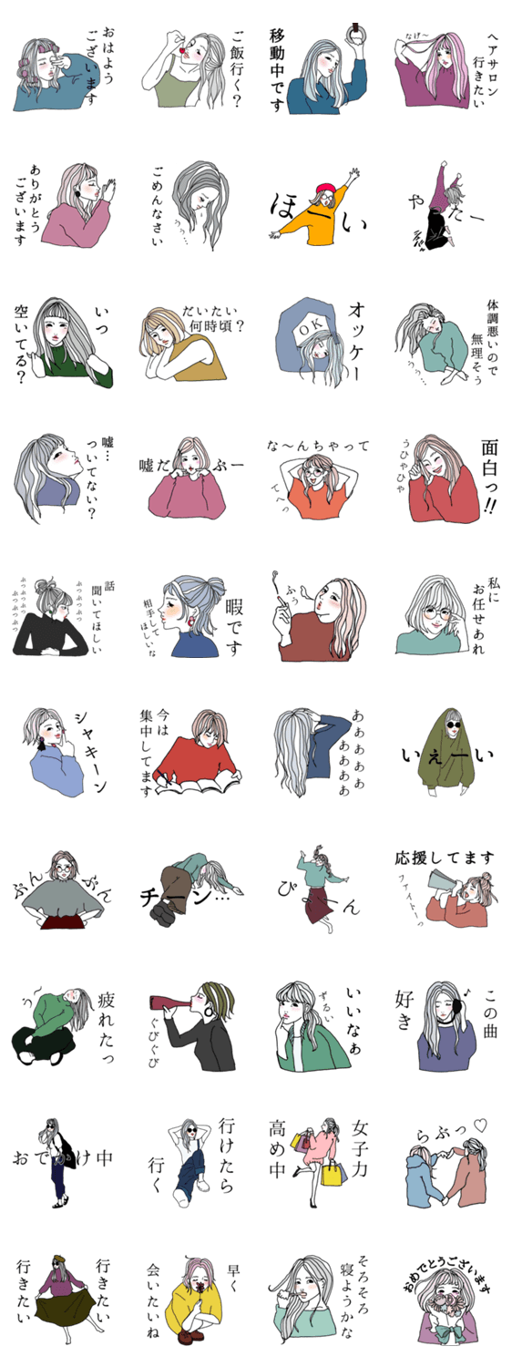 可愛くておしゃれな女の子達のスタンプ。女子高生、女子大生、社会人、主婦の方でも使いやすい日常会話。シュールな表情も◎人気の『女性達…』のバージョン2です