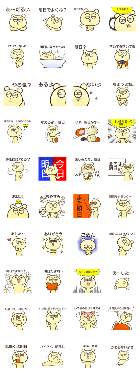 明日になればなんとかなる。明日、そう全ては明日。明日になったらきっと…本気を出すクマさんのスタンプです。
