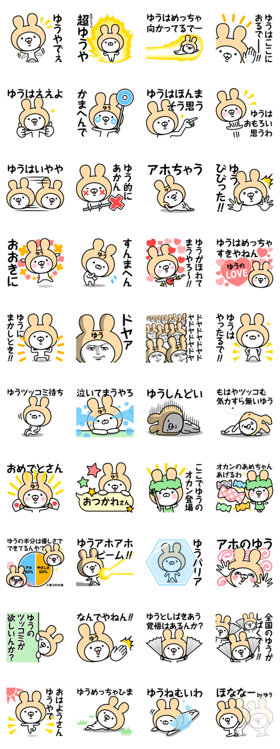 ゆうさん用の名前で方言スタンプ。ユウさんが使える関西弁・大阪弁のうさぎです。ゆうき、ゆうた、ゆうこ、ゆうかさんなどは是非。