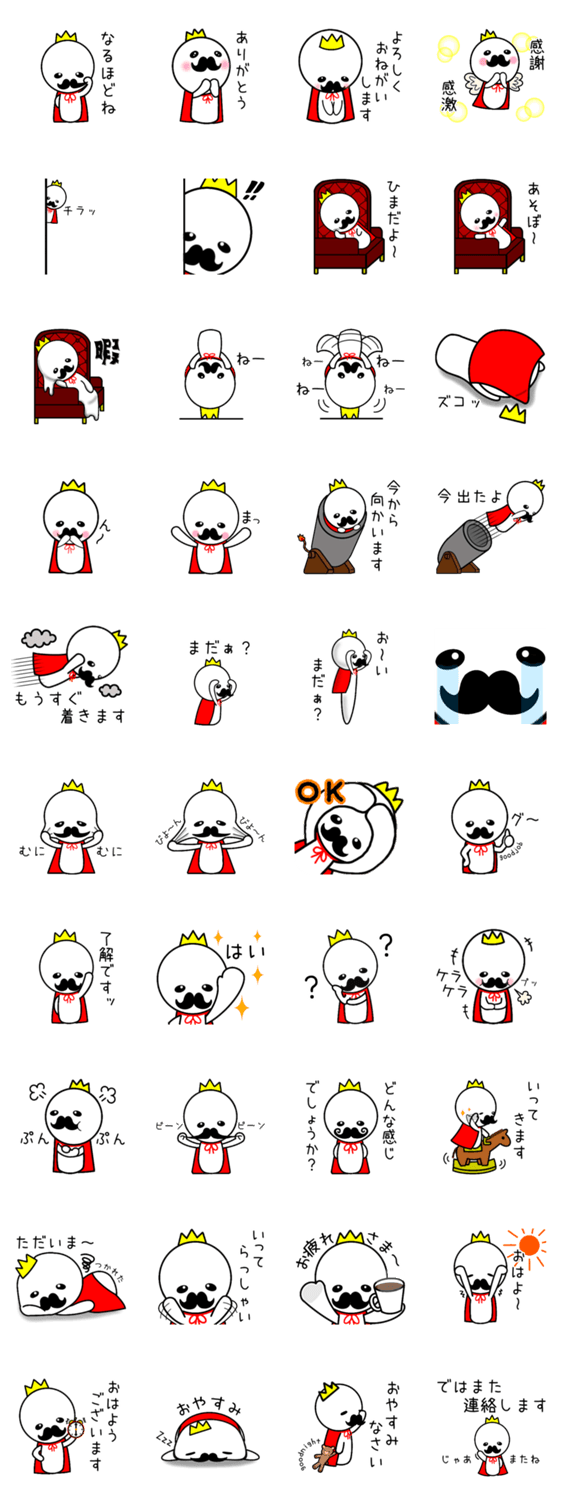 ひげがチャームポイントの「ひげきんぐ」が贈る、 日常でよく使う言葉のスタンプです♪