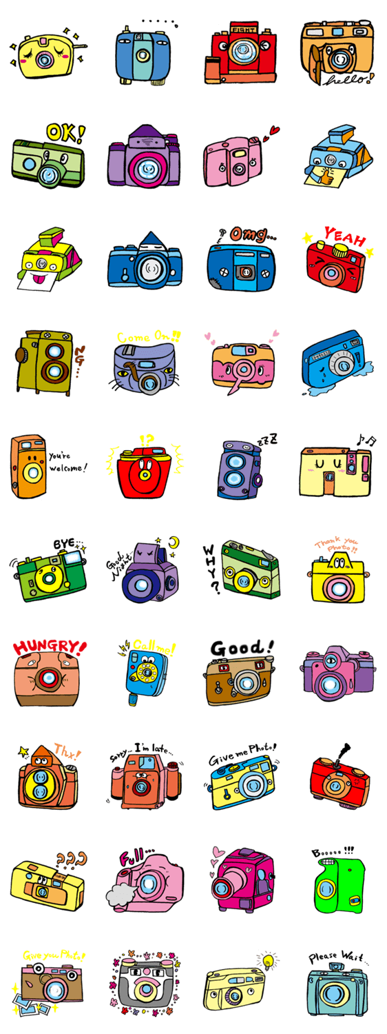 こんにちは!はじめまして!「CAMERA FAMILY」は、ユニークなカメラたちをキャラクターにしたスタンプです。あなたの日常会話に「パシャり!」と登場させてください!
