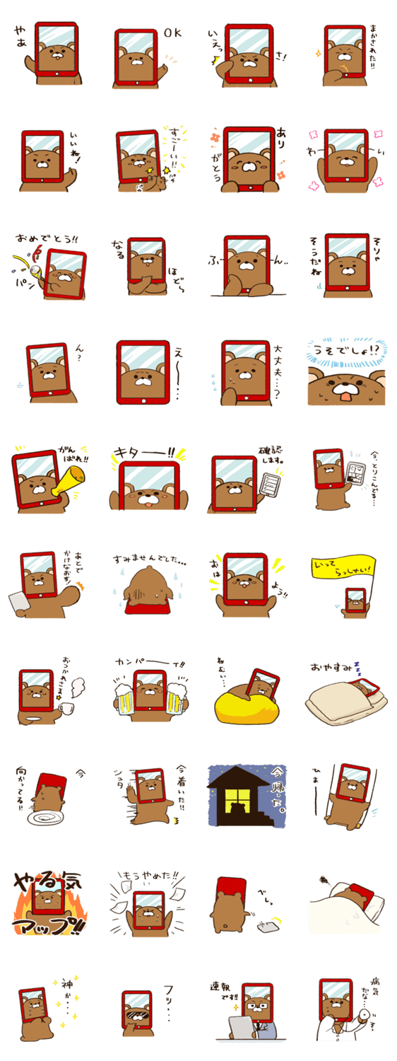 タブレットをかぶったクマさんのスタンプです。日常で使う言葉やシチュエーションを集めました。