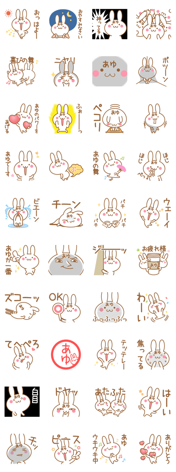 あゆちゃんが使うスタンプです。あゆみ,あゆこ,あゆえ,あゆり,あゆむ,歩実,鮎子,歩夢,歩武,鮎見,歩生,亜由子,歩子,亜有子,渉,亜由美,阿弓など全国のあゆ専用の名前スタンプ