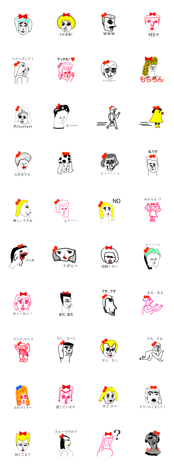 赤いリボンがよく似合う人々が登場するスタンプです。