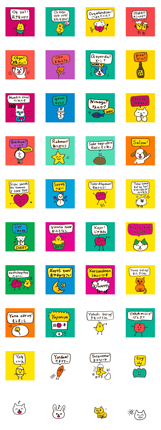 ウズベキスタンで話されるウズベク語のスタンプです 第二弾です!ウズベキスタンのお友達とぜひ仲良くなってください!