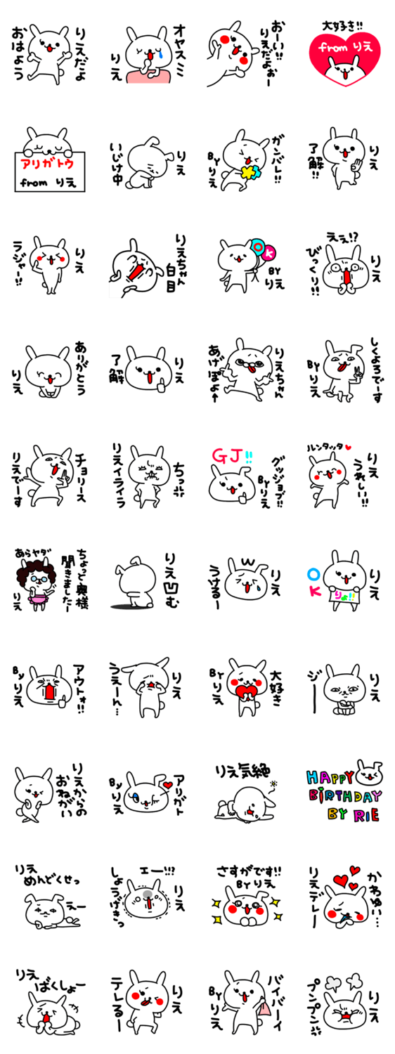 りえこ、りえの、りえみ、りえか、など「リエちゃん」と呼ばれている人のスタンプ。かわいいうさぎと日常会話で使いやすい。