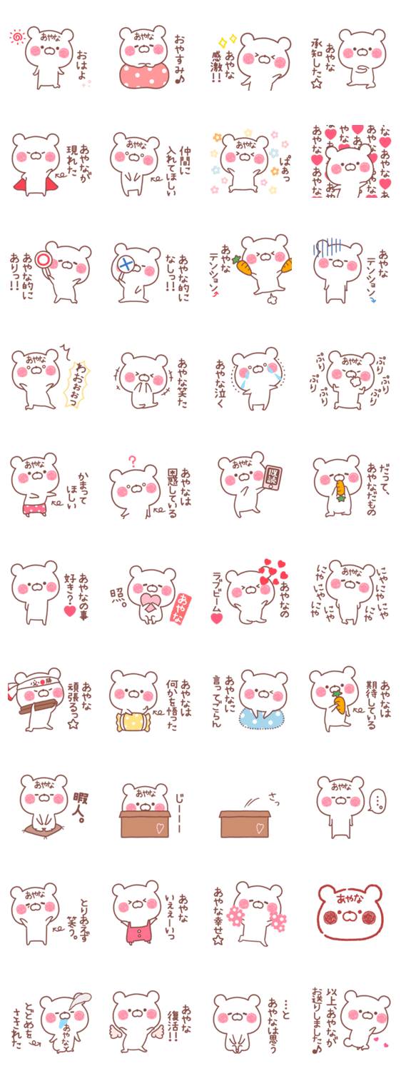 彩名、彩菜、彩奈、亜弥奈、亜矢奈、亜矢菜、文菜、礼奈、絢奈など、あやなちゃんが使える名前スタンプ。カップルやお友達、ご家族へ毎日使える自分専用スタンプです。