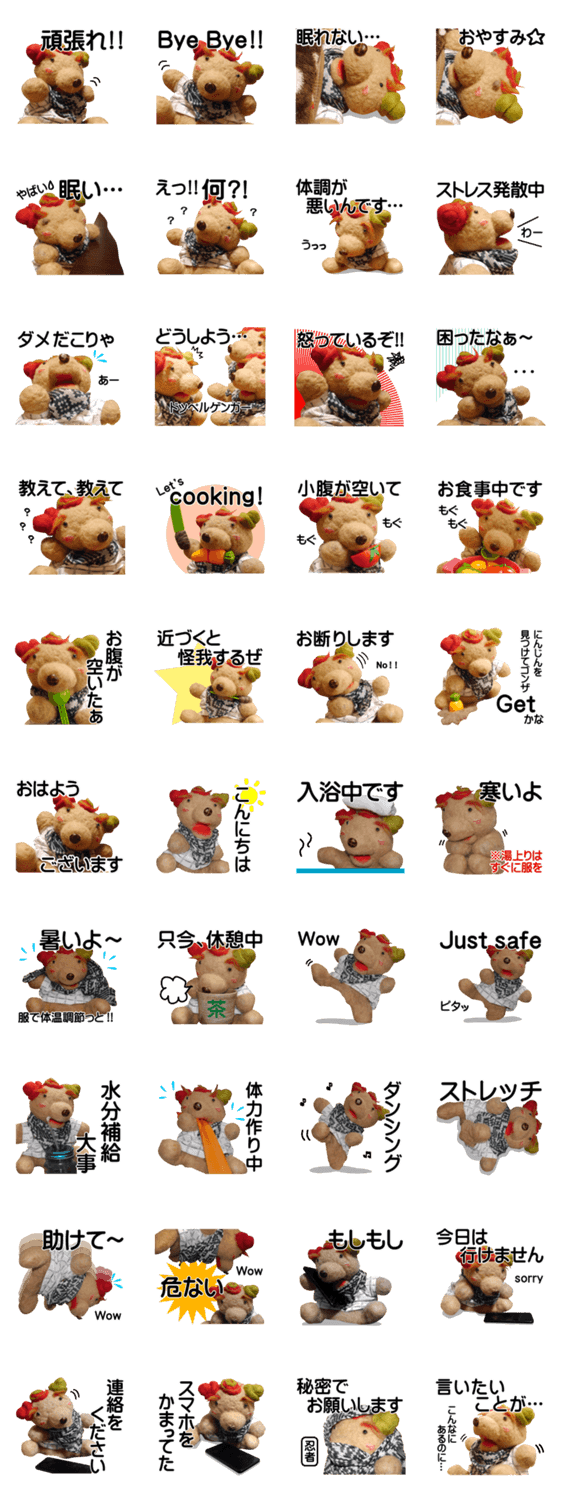 このスタンプはリアルな熊のぬいぐるみをスタンプにしたものです。ゴンザという名前の熊が可愛らしいです。ぬいぐるみはオリジナルです。