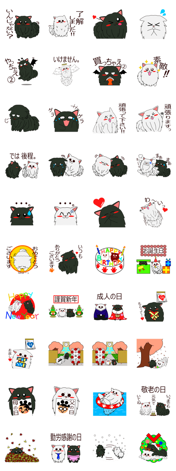 白と黒のポメラニアンが表情豊かにささやきます。イベントで使えるスタンプも盛りだくさんです。