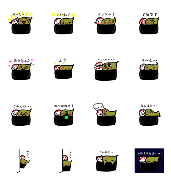 | スタンプ説明 | お寿司のかにみそを普段の会話で使える可愛いスタンプにしてみました。 |
