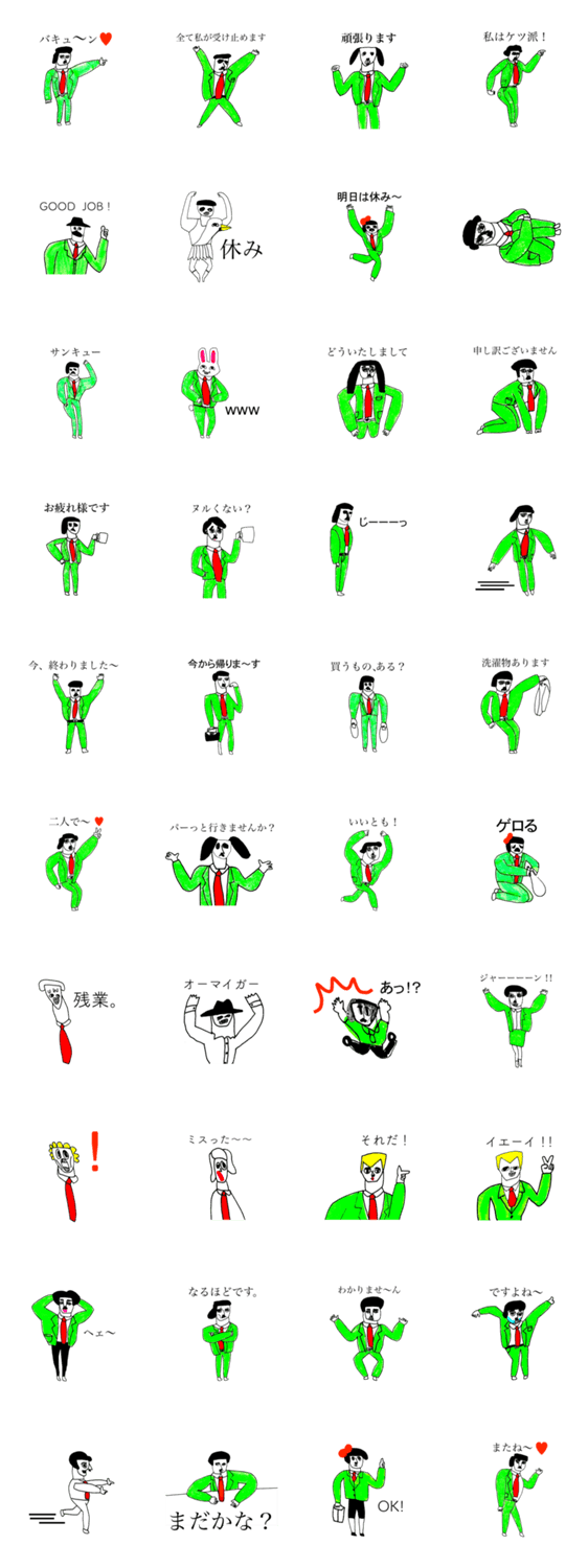 緑を愛するサラリーマン(社会人・会社員・ビジネスマン)のラクガキスタンプです。ミドリのスーツがいい感じです。
