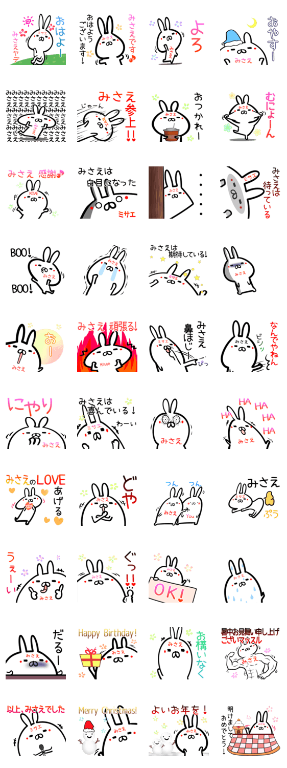 | スタンプ説明 | みさえちゃん/ミサエさん用の可愛いウサギのゆるい名前(なまえ)/あだ名スタンプ。Misae/美彩/美佐枝/美冴/美佐恵/操江/未沙絵/美佐絵/実咲枝等の名前専用♪お正月挨拶入♪ |