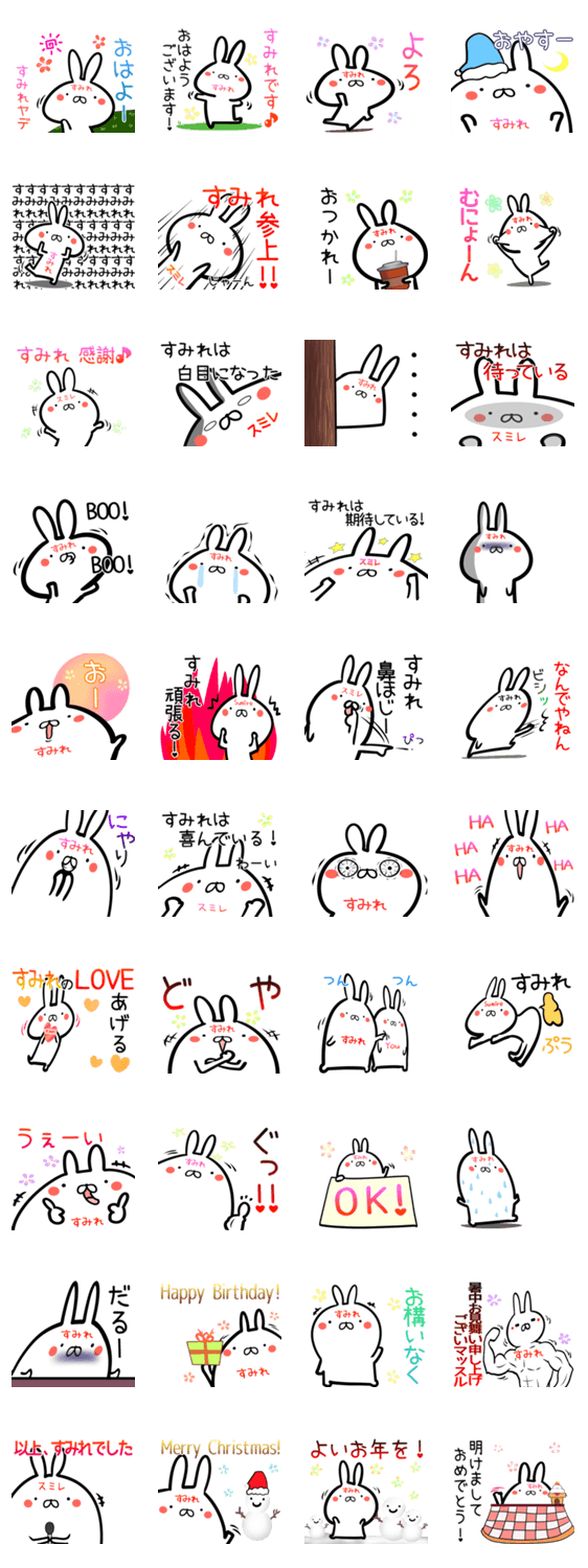 | スタンプ説明 | すみれちゃん/スミレさん用の可愛いウサギのゆるい名前(なまえ)/あだ名スタンプ。sumire/菫/スミレ/純連/寿美礼/須美礼/純麗/清麗等の名前専用♪クリスマス,お正月挨拶入♪ |