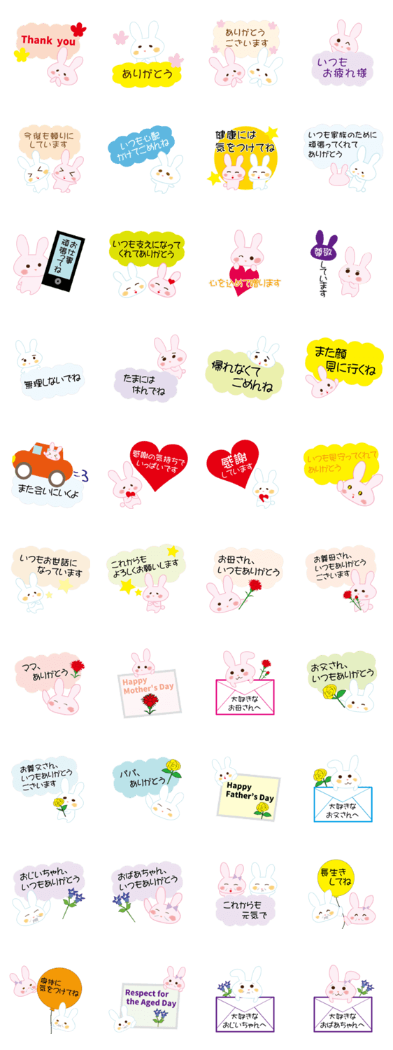 母の日、父の日、敬老の日に大切な家族に感謝を。お母さん、お義母さん、お父さん、お義父さん、おじいちゃん、おばあちゃんに送るスタンプ。好きウサギ応援隊第17弾。