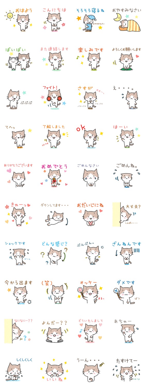 わかりやすく使いやすい!便利でかわいい猫のスタンプです。眉毛がある癒し系猫の「まゆねこさん」のスタンプ。黒背景対応。よく使う言葉の基本セットです。