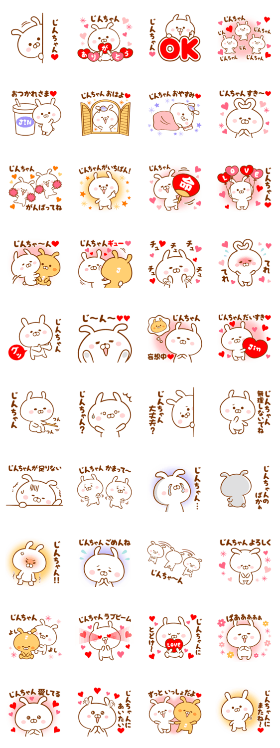 じん/じんいち/じんぺい/じんや/じんぺい等、じんちゃん、じんくんに送る名前・あだ名スタンプです。かわいいウサギで恋人、夫婦、友達に気持ちを伝えましょ♥