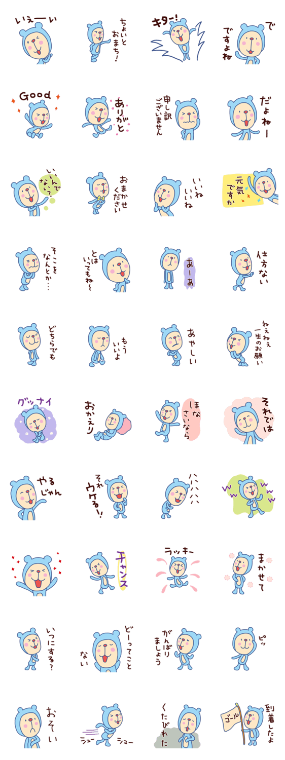 | スタンプ説明 | さるくま(くまの着ぐるみ)第3弾。 クマに憧れクマになりたいサル。 本当にクマに見えているかはどうかは、本人はあまり気にしていないようである。 |