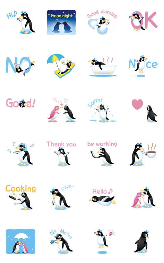 ペンギンキャラクターのスタンプ。 日常の行動や気持ちを楽しく伝えてくれます。 かわいい。楽しい。オシャレ。