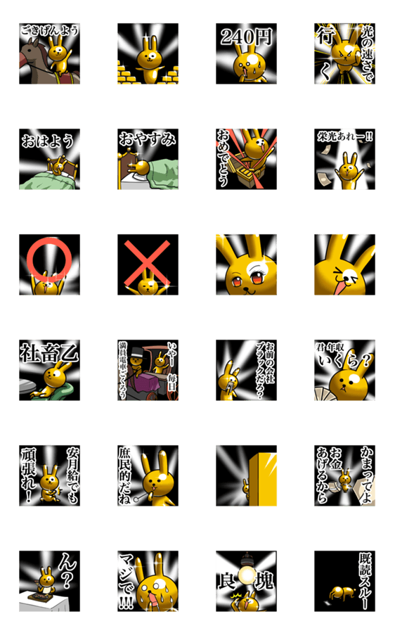 光る金色のウサギ(金持ちウサギ)のスタンプ。金縁無しの最高級プレミアムではないスタンプです。一般人~お金持ち、社長、セレブ、リッチピープルまで楽しめるスタンプ。