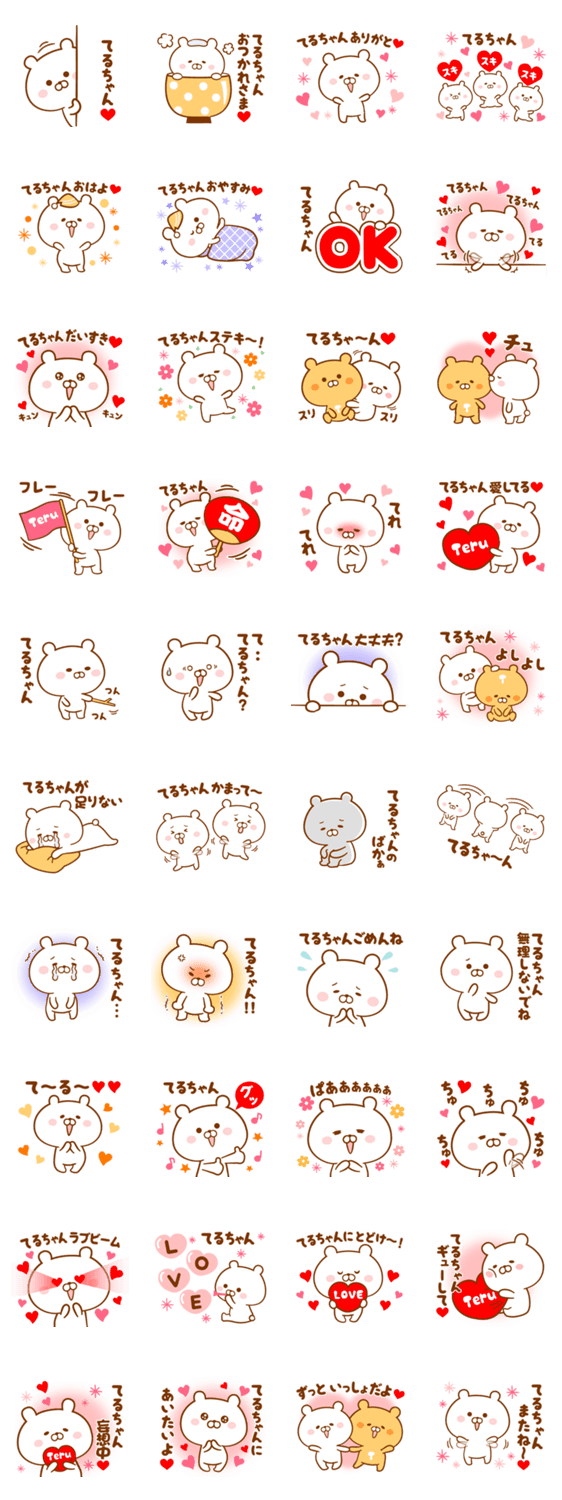 てるお/てるゆき/てるひこ/てるあき/てるよし/てるまさ/てるこ/てるみ等、てるちゃん、てるくんに送る名前・あだ名スタンプです。恋人、夫婦、友達に気持ちを伝えましょ♥