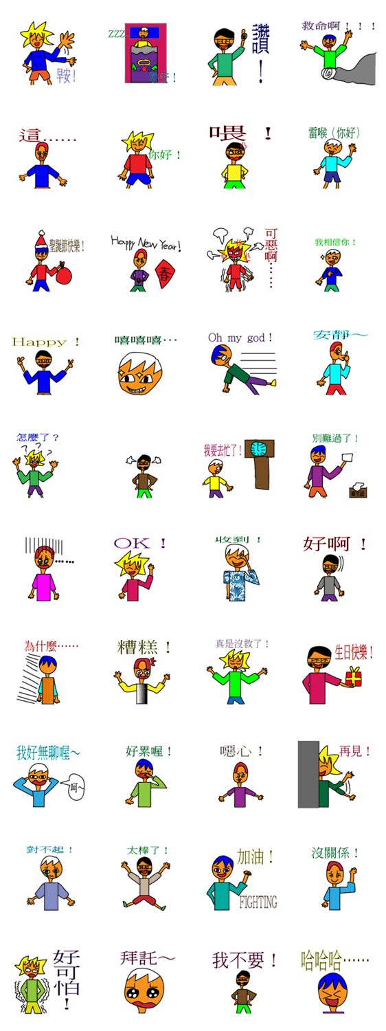 | スタンプ説明 | Draw by the fifth grade boy ! Let "comic people " say hello to you ! 5 amused and sad comic people fully speak for you. |
