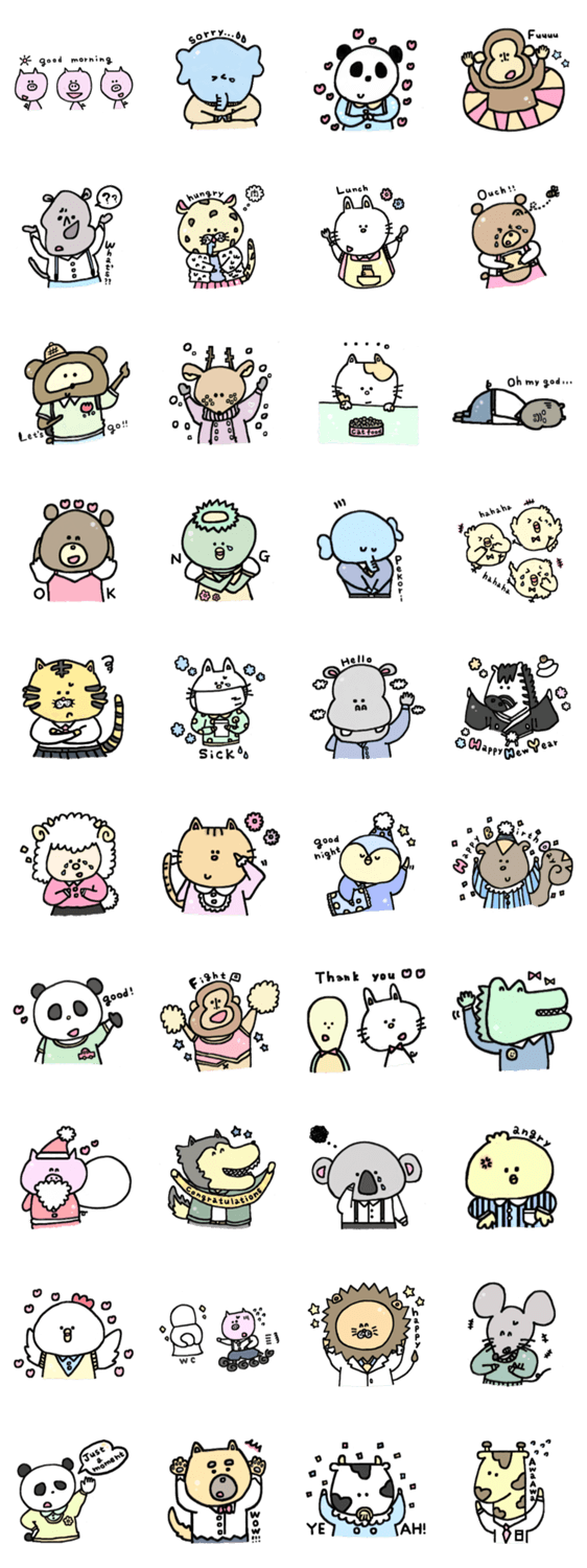 にぎやかな、たくさんの動物たちの気持ちを表した日常スタンプです。うれしい時、かなしい時、いろんな場面でこの動物たちを選んであげてください。