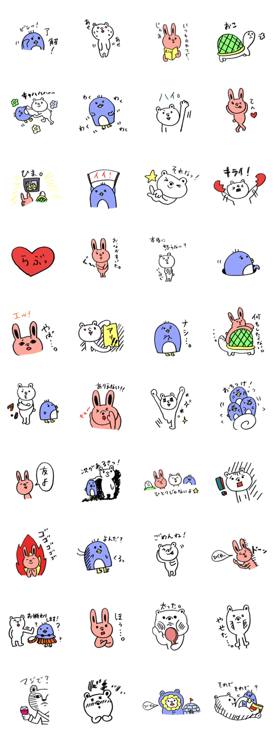 しろくまとぺんぎんとウサギとカメが ゆかいなスタンプになりました。