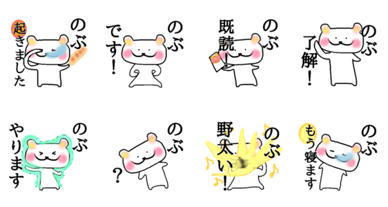 「のぶ」さんが使うくまスタンプ、基本セット。Nobu、ノブ、信子、信長、隆信、伸恵、信孝、信恵さんなどに。