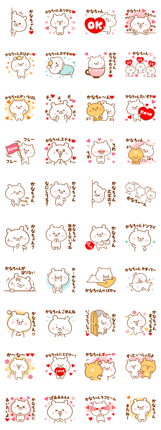 かな/かなえ/かなこ/かなで/かなめ/かなた/金田/金森等、かなちゃん、かなくんに送る名前・あだ名スタンプです。恋人、夫婦、友達に気持ちを伝えましょ♥