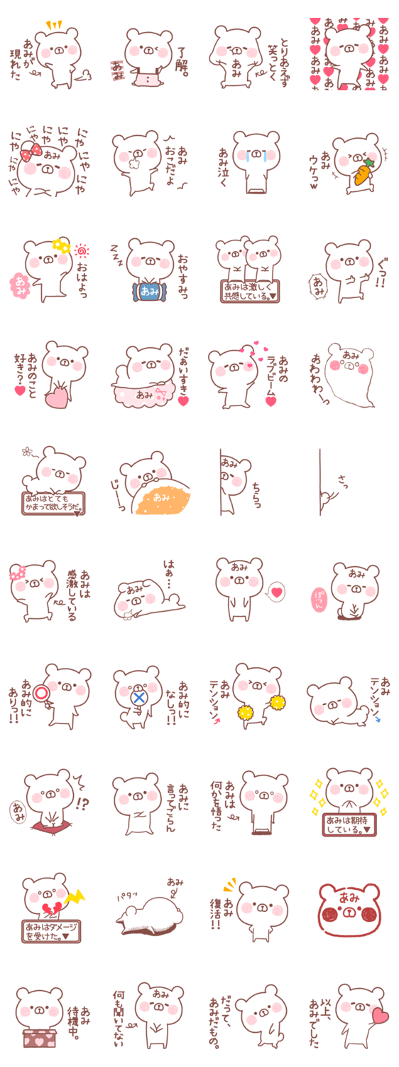 あみこ、あみか、亜美、亜実、愛実、有海、亜未、愛海、杏実、彩美など、あみちゃんが使える名前スタンプ。カップルやお友達ご家族へ毎日使える自分専用スタンプです。