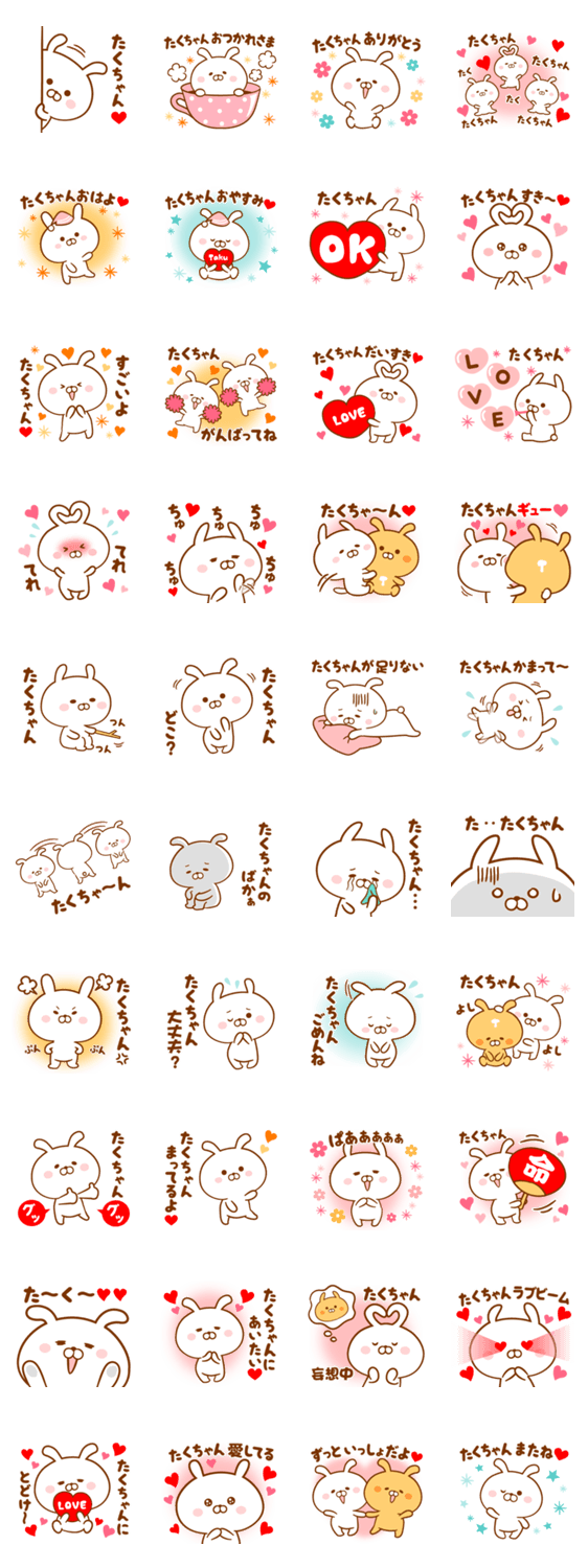たくや/たくみ/たくま/たくと/たくじ/たくろう/たくぞう等、大好きなたくちゃん、たくくんに送る名前・あだ名スタンプです。恋人、夫婦、友達に気持ちを伝えましょ♥