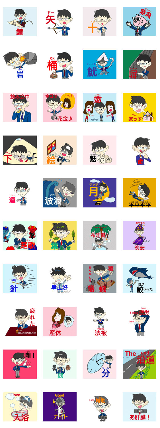 | スタンプ説明 | サラリーマン めがね君のサラリーマンライフを描いたスタンプ第8弾 いい漢字(感じ) |