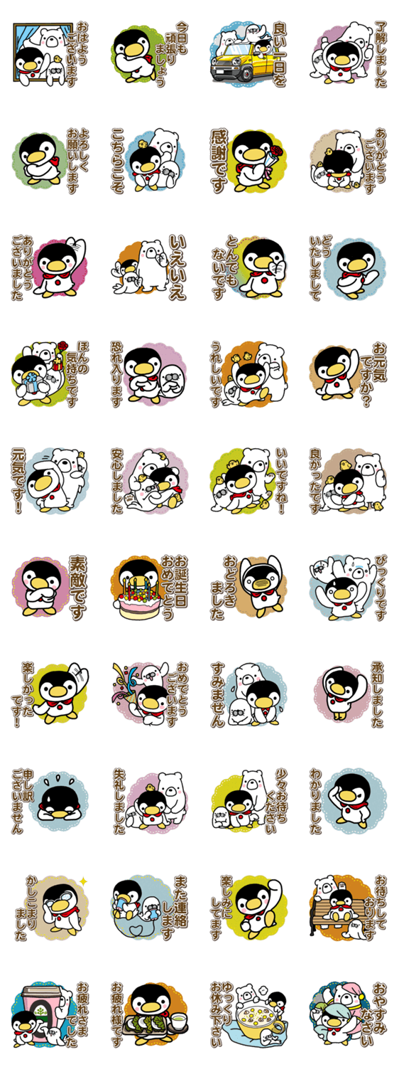 キュートでほんわかしたペンギンのスタンプ第10弾です。手書きの文字と普段使いやすいイラストです。アザラシ、しろくま、ひよこたちが一緒にメッセージを届けます。